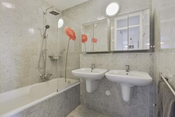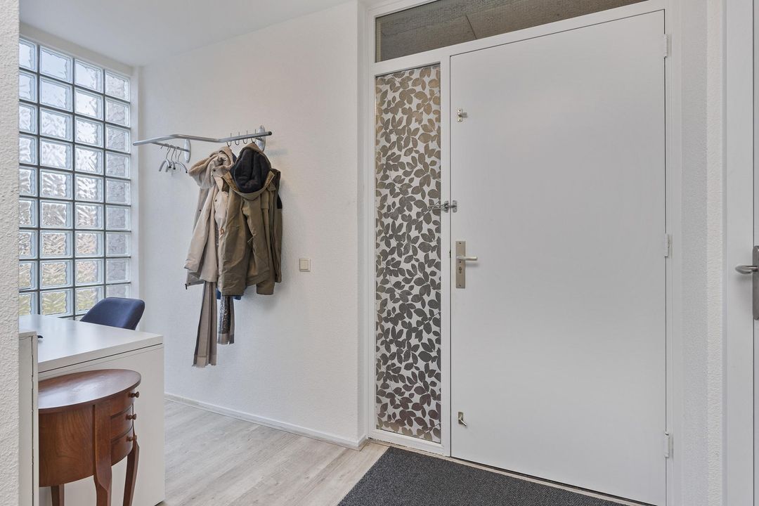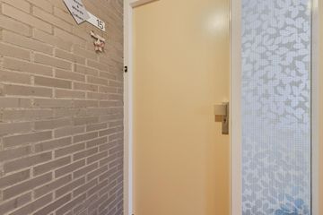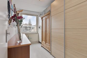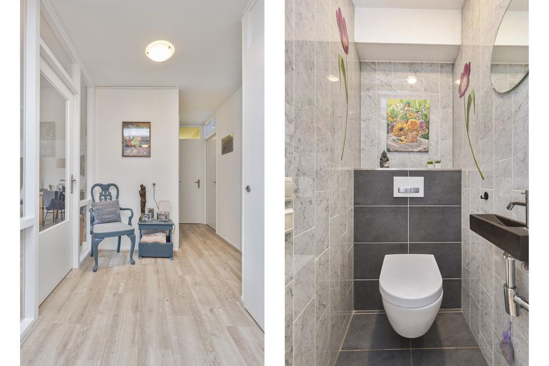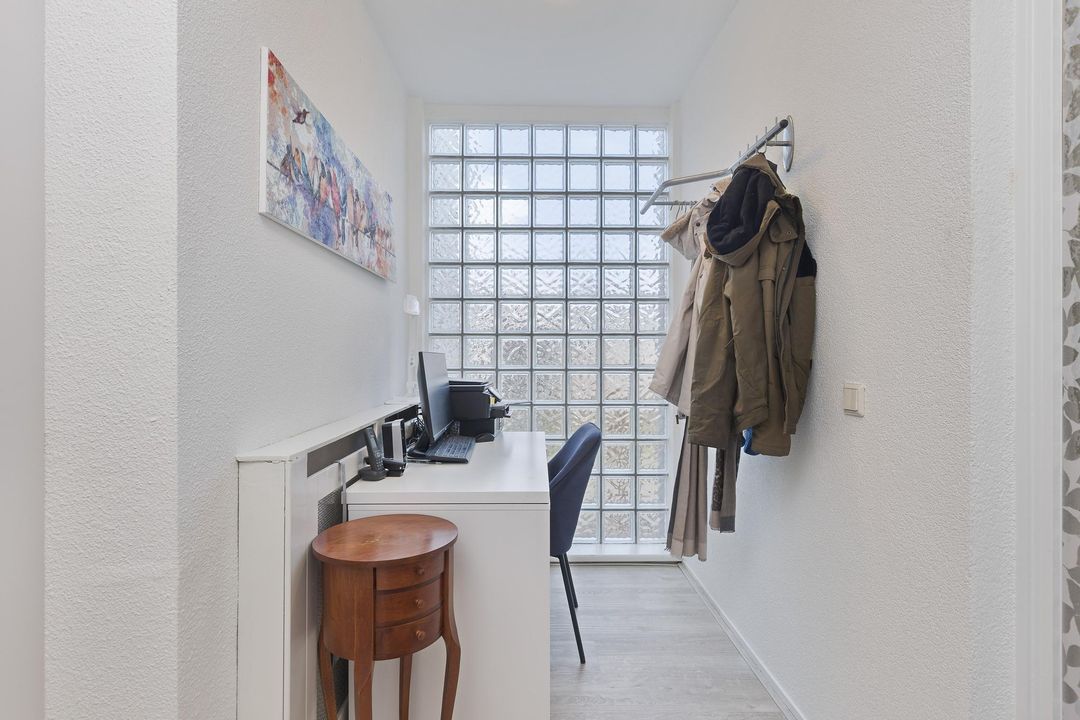 Ruime entree die in open verbinding staat met de woonkamer en heerlijk licht is door de glazen blokkenmuur aan de voorzijde van het appartement. Er is een met meterkast, toilet met vast closet en fonteintje en toegang naar de twee slaapkamers, de badkamer en dus ook de woonkamer. Er ligt een fraaie pvc vloer met houtlook door het hele appartement. Er zijn 2 grote slaapkamers.