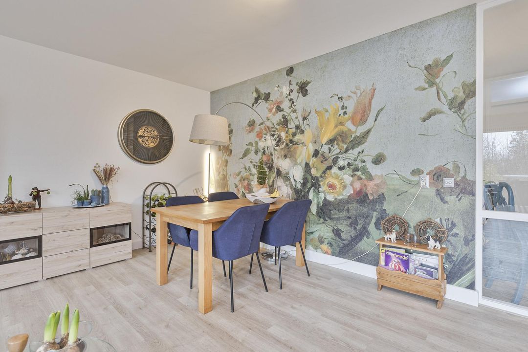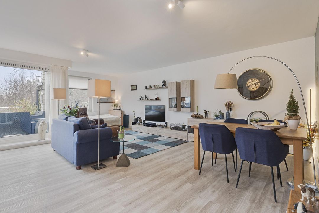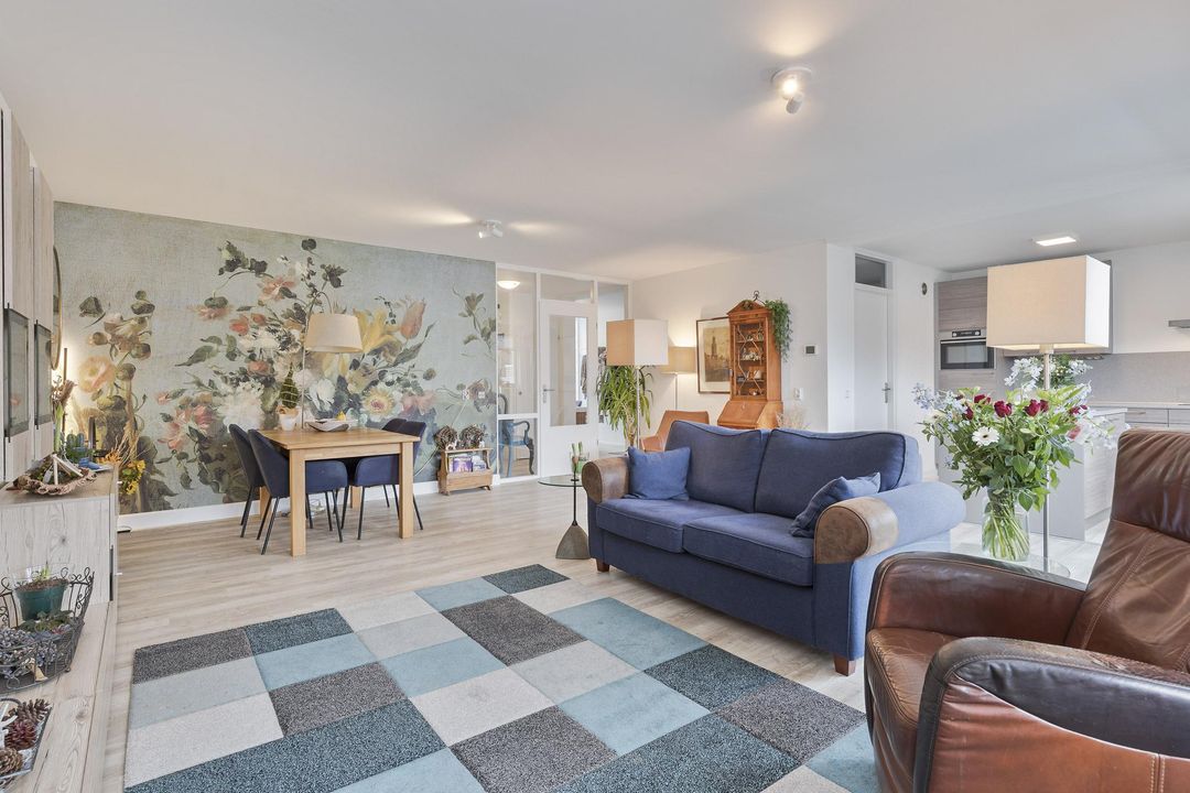 Een fijne, brede woonkamer met meerdere raampartijen en een schuifpui met hor naar het terras. De vele ramen zorgen voor veel licht en goed zicht over het Essenhakhout.
