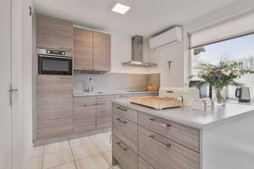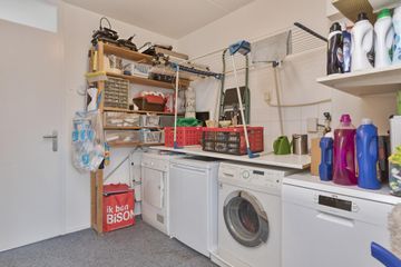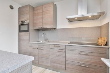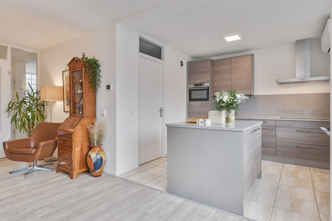 De half open keuken heeft veel kastruimte en werkblad en inbouwapparatuur: een inductiekookplaat, combioven, koelkast, vaatwasser. Aansluitend de praktische bijkeuken met opstelplaats voor CV en wasmachine.